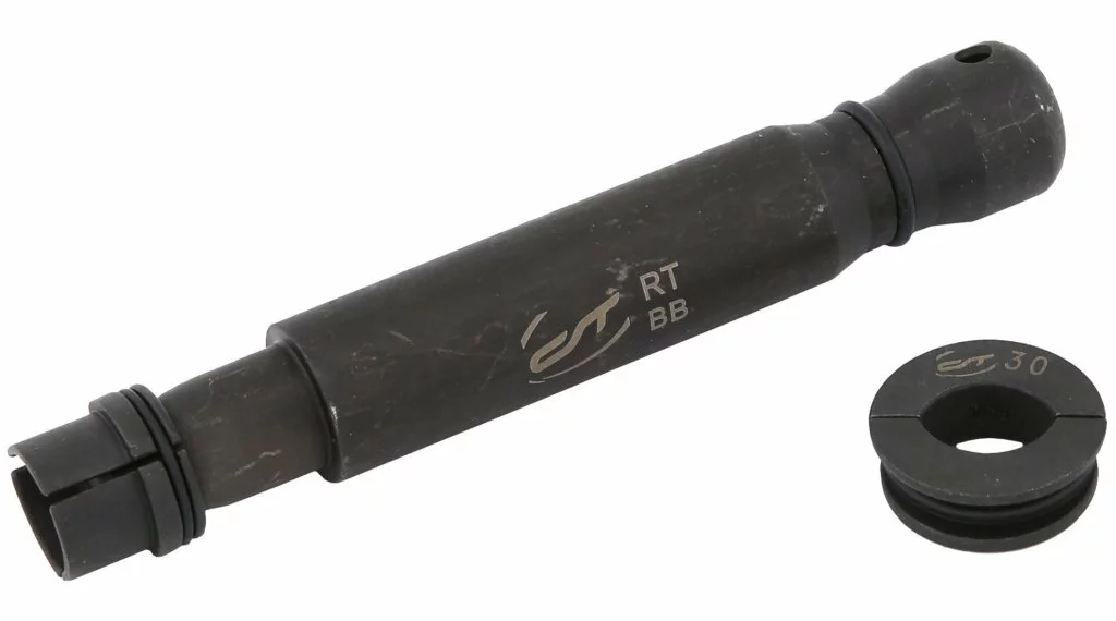 The CONTEC „RT-BB-30-86-90“ press-out tool enables easy and controlled removal of all BB30, BB86 and BB90 press-fit bottom brackets. After the crank has been removed, the practical tool can simply be inserted through the bottom bracket shell with the back first and snaps into the bearing shell.